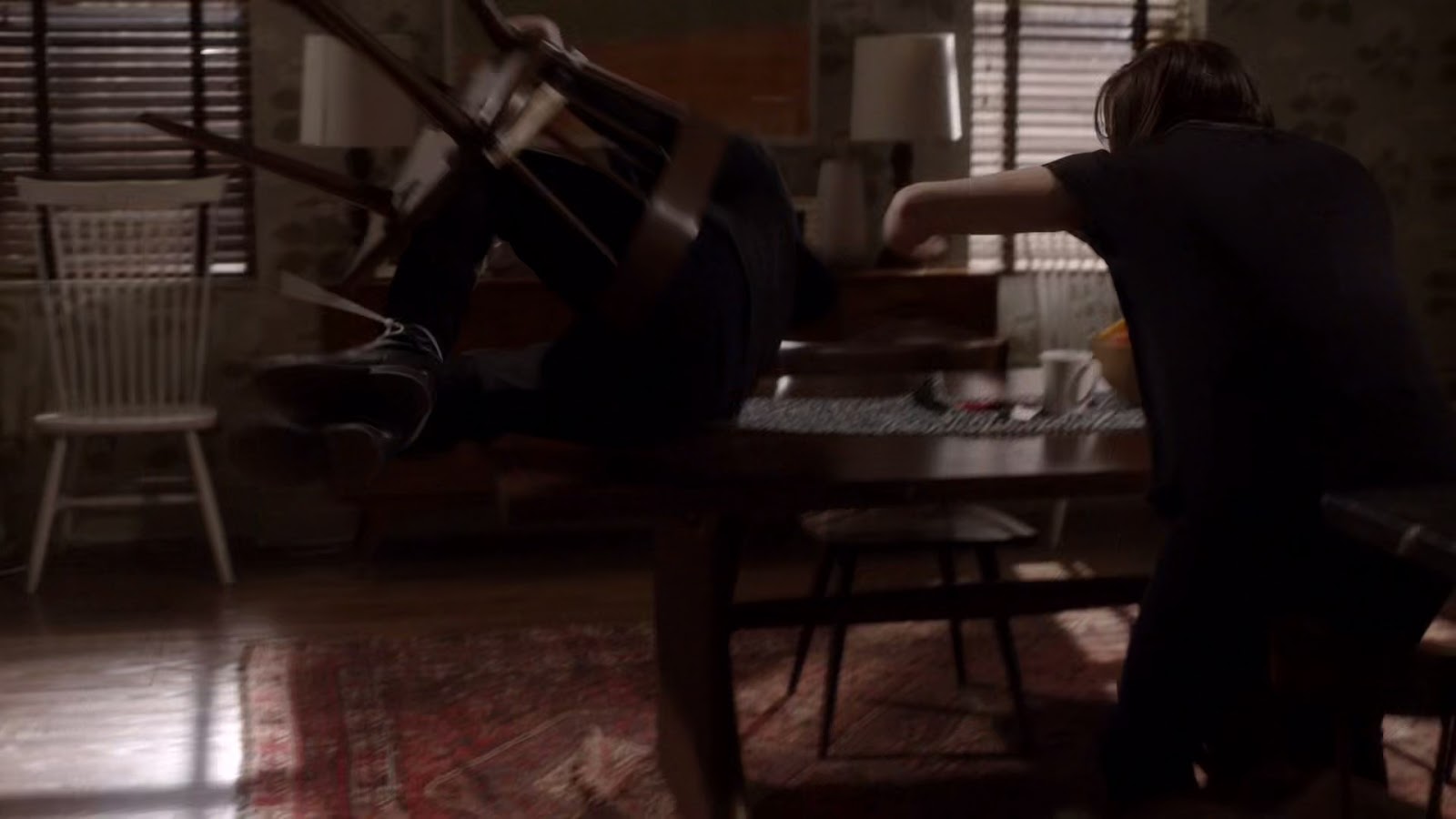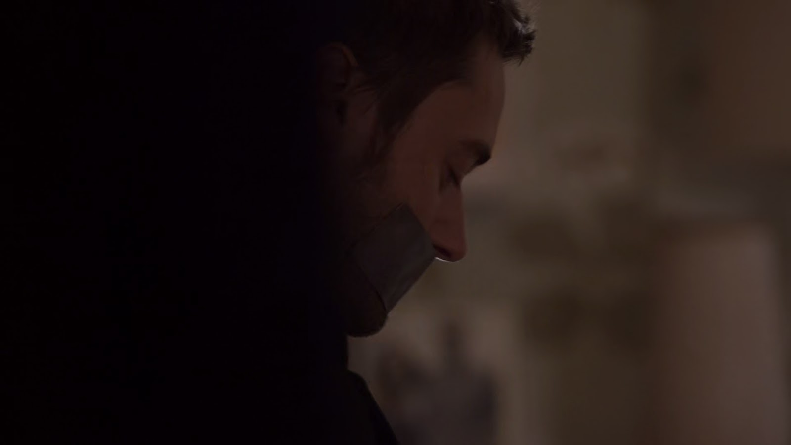 Storyline: Tom gets captured by the Pavlovich Brothers, tied up to a chair, gagged with grey duct tape and delivered to his wife. His hands are attached to each side of the chair, with plastic zip ties, and his ankles are bound together.